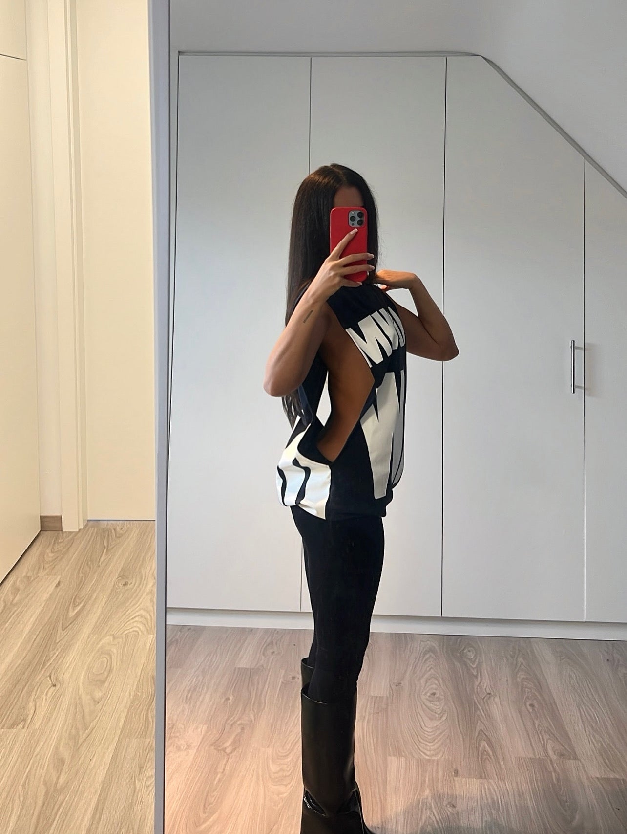 Ultra low-cut sleeveless tee with oversized side openings, bold printed graphics on the front and back, and a right-side slit designed to be tied into a knot for a custom fit.